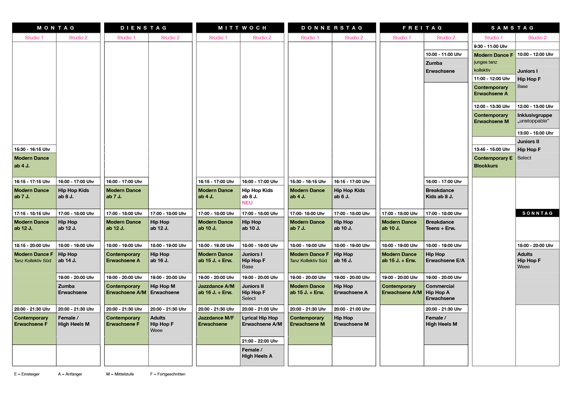 Auf dieser Seite findest du den aktualisierten Stundenplan. Hier kannst du dich in Ruhe nach einer Tanzrichtung umsehen, die deinen Vorstellungen entspricht.
